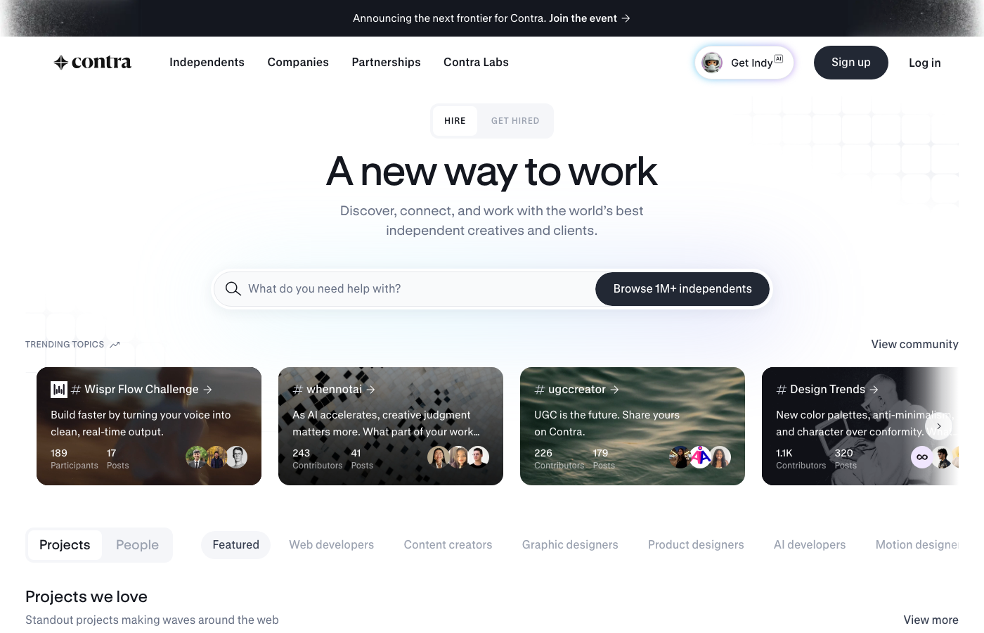 - Commission-free payment model — creators keep 100% of earnings. Contra charges clients a $19-29 contract fee plus Stripe processing, not the 10-20% that Upwork and Fiverr take.